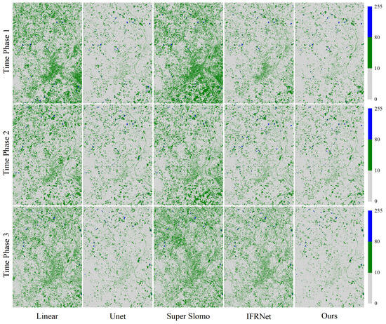 Pixel error map for comparative experiments of Experiment 2 for multi-temporal sequence image interpolation on the Sentinel-2 satellite dataset. Time phases 1, 2, and 3 represent the experimental results for the middle three time phases t = 0.25, 0.50, and 0.75. In the pixel error map, grey, green, and blue represent the absolute value of the pixel difference in the ranges 0–10, 10–80, and 80–255, with larger values representing larger errors.