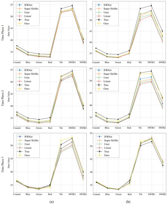 Spectral curves map at 100 random points for comparative experiments of Experiment 2 for multi-temporal sequence image interpolation on the Landsat-8 satellite dataset. (a,b) are the results of two time series from Experiment 2 of the Landsat-8 satellite dataset. For each time phase image, we plotted the average of the spectra of the real image and the interpolated results of the five methods at 100 random points.