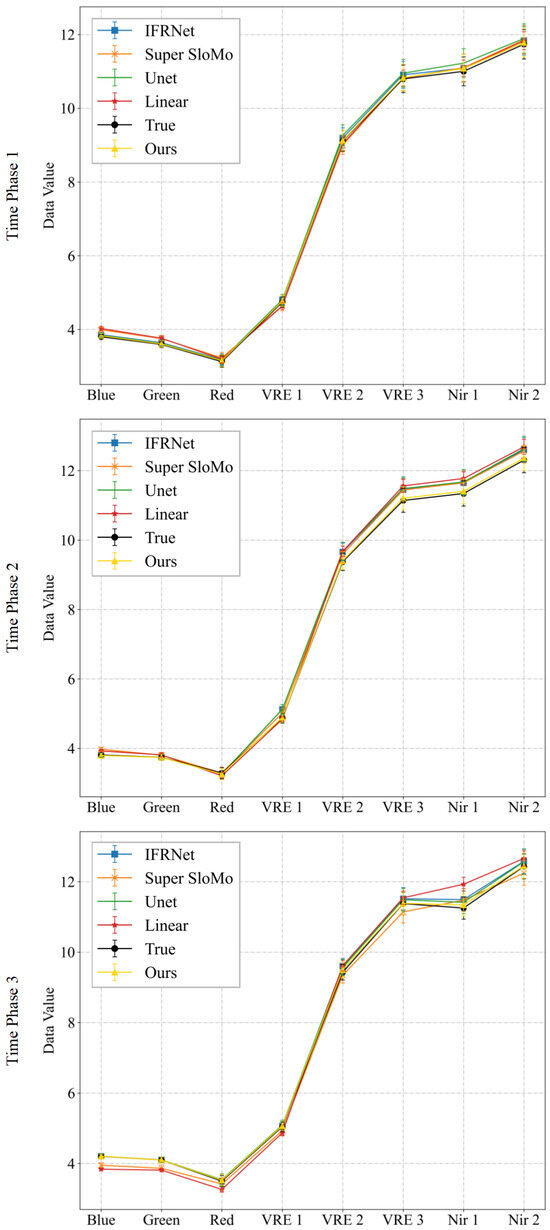 Furthermore, we provide a detailed analysis of why our method surpasses the other four techniques. The Linear method focuses solely on the pixel values to be interpolated in the images from the preceding and subsequent time phases, without taking into account the spatial and spectral features of the images. Unet considers the spatial features of the images from the preceding and subsequent time phases, but neglects the spectral features and the pixel correspondences in the temporal images (optical flow). Both Super SloMo and IFRNet take into account the spatial features of the images and the pixel correspondences in the temporal images. However, Super SloMo separates the refinement of the optical and spatial features into two phases, resulting in a disconnection between the two. IFRNet performs a joint refinement of the optical flow and the spatial features, but its interpolation effect is superior for RGB images and inferior for multispectral satellite images. In contrast, our proposed method excels at handling multispectral satellite imagery by extending the number of detail-compensated residual channels to match the number of spectra and implementing a spectral loss function to enhance the supervision of spectral learning.