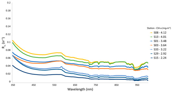 We performed reflectance (Rrs) measurements at 15 sampling stations using an ASD FieldSpec-4 spectroradiometer (ASD Inc., Falls Church, VA, USA, Malvern Panalytical, Malvern, UK). This instrument is specifically designed to operate within a wavelength ranging from 350 nm to 2500 nm.