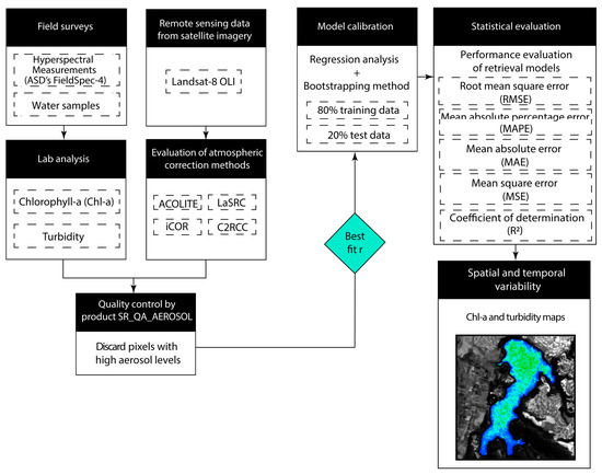 The proposed methodology included the following main steps: (i) the in situ acquisition of spectral signatures, water sample collection, and OLI L-8 scene selection; (ii) the determination of Chl-a (mg·m−3) and turbidity (NTU) concentrations, and evaluation of atmospheric correction models; (iii) atmospheric distortion pixel identification (high aerosol levels) to avoid introducing external error into the spectral retrieval model; (iv) the selection of spectral bands (with indices and reflectance band ratios) based on best-fit regressions with in situ values, ACOLITE and C2RCC being selected as the best atmospheric correction models to estimate Chl-a and turbidity values, respectively; (v) bootstrapping the statistical assessment to enhance the spectral retrieval model most suitable for each water quality parameter; furthermore, we used a set of five distinct statistical metrics to determine the precision and accuracy of the modeling process; and finally, (vi) the generation of spatiotemporal images for the water quality parameters at different dates and seasonal conditions.