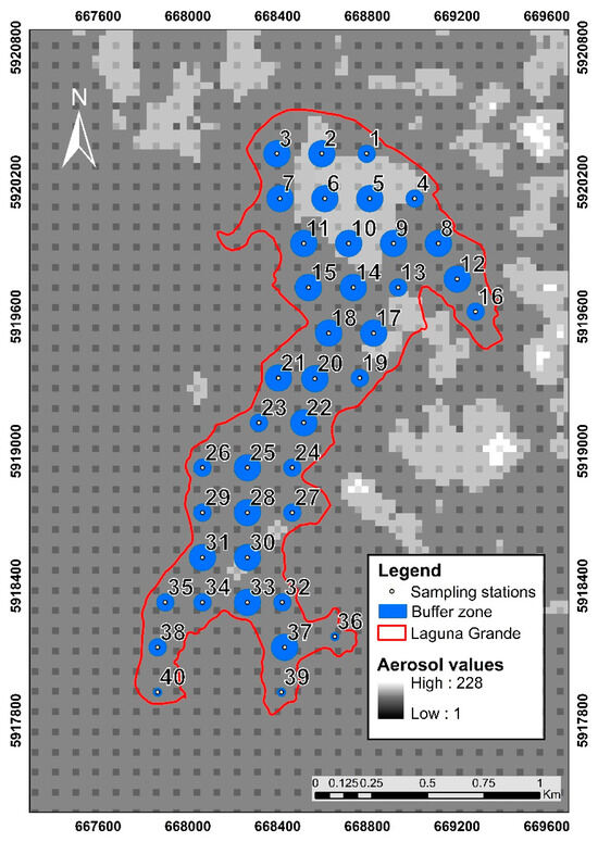 Chl-a and turbidity sampling stations were systematically located by covering a buffer of 60, 40, and 20 m over the LaSRC model quality image, which represents the aerosol levels in the scene (applying only a buffer of 40 and 20 m to those stations close to the lakeshore). Note that those stations located in pixels with high aerosol values were excluded from the correlation process.