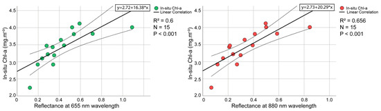 Chl-a has a unique absorption band that varies with its concentration, enabling the detection of specific spectral signatures through remote sensing. Results revealed that the absolute values at wavelengths of 655–880 nm and 990 nm exhibited the highest values of R2. This suggests a stronger correlation between the Chl-a concentration and the reflectance at these specific wavelengths. R2 values obtained for the relationship between the in situ Chl-a concentration and the reflectance values at 655 nm and 880 nm were 0.6 and 0.656, respectively (Figure 7). These coefficients indicate an important correlation in these spectral bands, aligning closely with the red and near-infrared (NIR) regions of the electromagnetic spectrum.