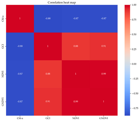 Pearson’s coefficient values were used to assess the relationship between three vegetation indices and chlorophyll, i.e., NDVI, GNDVI, and GCI, and the Chl-a concentration values, using data from the green, red, and NIR regions. Notably, these indices (NDVI, GNDVI, and GCI) showed a statistically significant correlation (p ≤ 0.001), with Pearson’s coefficient values of −0.87 for NDVI and GNDVI, and −0.88 for GCI (Figure 8). Hence, GCI was selected as the best option to build the retrieval model. The sensitivity of the Chl-a concentration to multiband reflectance combinations is clearly demonstrated in Figure 8, highlighting its higher responsivity compared to a single-band reflectance.