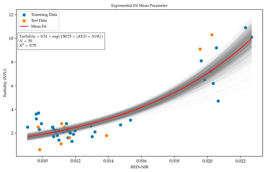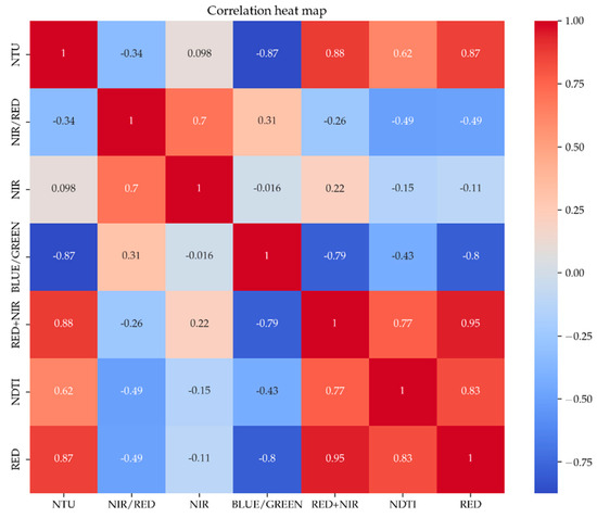 The turbidity parameter evaluation was based on previous studies [11,44,51,52]. These showed that reflectance values in the red and NIR bands had a strong correlation with suspended sediment concentration and turbidity levels. As a result, these spectral bands are considered as crucial indicators for assessing turbidity in water bodies [52]. Then, an empirical regression analysis technique was used to establish a relationship between field measurements and satellite data. For turbidity (NTU) estimation, different standard combinations for this parameter (Table 4) were applied, including NIR/red, NIR, blue/green, red + NIR, together with the normalized difference turbidity index (NDTI) [51].