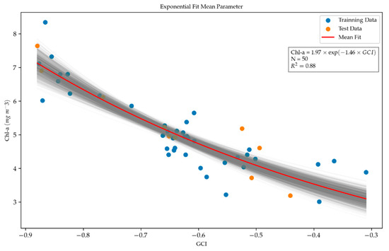 The green chlorophyll index (GCI) was selected as the optimal choice for constructing the Chl-a retrieval model in Laguna Grande, despite being a spectral index used in terrestrial applications [49]. Results showed a remarkable sensitivity for Chl-a concentration to various multiband reflectance combinations, underlining the high responsiveness of this index. Similar results were observed in other water quality studies, where spectral indices such as the NDVI and GNDVI were used (e.g., [59,60,61]). The CGI showed the highest relationship with an R2 value of 0.88, making it the best choice for the Chl-a retrieval model in the study lake. The robustness of the model was assessed by the bootstrapping method, confirming its statistical significance. Results were also in line with previous studies that showed a strong agreement (R2 = 0.73) with the B5 (near-infrared)/B3 (green) spectral ratio index derived from the OLI sensor and in situ Chl-a levels [53].
