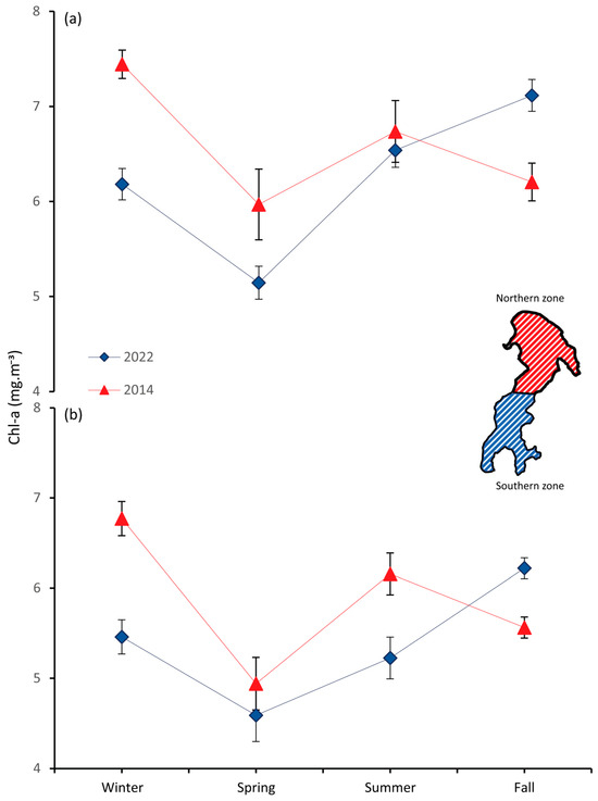 A detailed analysis comparing the 2014 and 2022 data (Figure 16 and Figure 17) revealed fluctuating Chl-a mean values. Considering the year 2022, Chl-a values for the northern zone (Figure 17a, blue line) varied from 6.2 mg·m−3 in winter, dropping to 5.1 mg·m−3 in spring, increasing to 5.4 mg·m−3 in summer, and showing a peak at 7.1 mg·m−3 in fall. This pattern was consistent in both northern (Figure 17a, blue line) and southern zones of the lake. However, in the southern zone (Figure 17b, blue line), mean values were consistently lower for each season: 5.5 mg·m−3, 4.6 mg·m−3, 5.2 mg·m−3, and 6.2 mg·m−3, respectively.