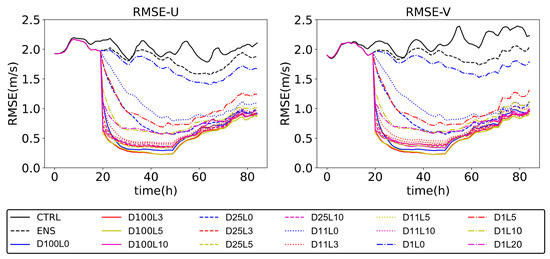 Figure 2 shows the RMSEs of U and V from 031200 to 070000 using different observation densities and localization radii. With fixed observation errors, a sparser observing network (the density less than 4%) favors a larger localization radius to achieve the best filter performance, and a denser network favors a smaller localization radius, which is consistent with findings from the study of Ying et al. [29]. It is worth noting that the optimal localization radii for the different densities are not the smallest when the density is greater than 11.1%. Furthermore, in time series, the RMSEs reached the minimum value at 051400, and no significant improvement was observed thereafter during the analysis period. Therefore, RMSEs at 051400 are also selected to find the optimal localization radii.
