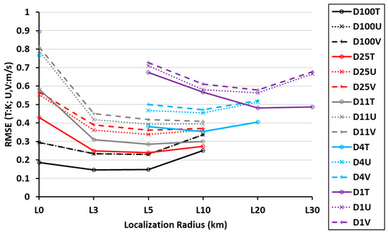 Figure 3 displays the values listed in Table 2. These experiments include the control run (CTRL), ensemble forecast (ENS), and different DA experiments with varying localization radii (D) and observation densities (L). This figure shows the relationship between assimilating different observation densities and RMSE in the case of variable influence radius. This figure proves that the value we selected from Table 2 is indeed the smallest.