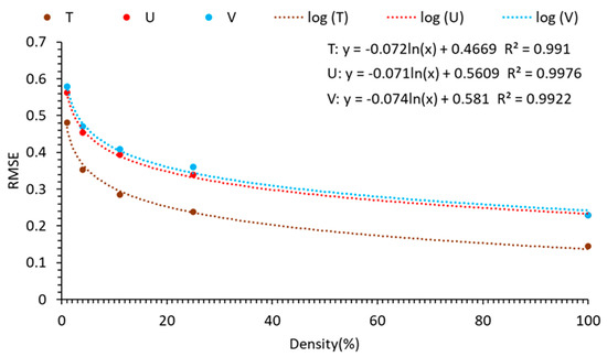 The lowest RMSEs are selected from Table 2 for each combination of observation densities. Then, the relationships between RMSEs for T, U, V, and observation densities are shown in Figure 4. These relationships are characterized by high correlation coefficients, as indicated by all the coefficients of determination (R2) exceeding 0.99.