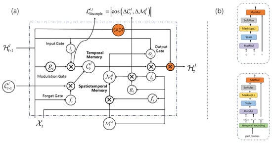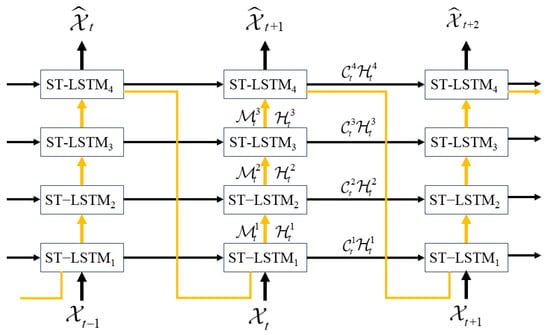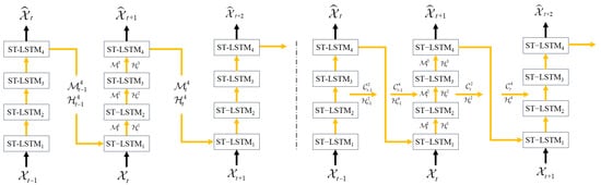 where is the hidden state at layer l and time t, is the input, and are the weight matrices, is the bias, and f represents the activation function. (2) Capturing Temporal Dependencies: Temporal dependencies are captured as the model transmits hidden states from one time step to the next (i.e., from to ). This dual-stream approach enhances the model’s ability to thoroughly analyze and forecast changes in spatiotemporal sequences.