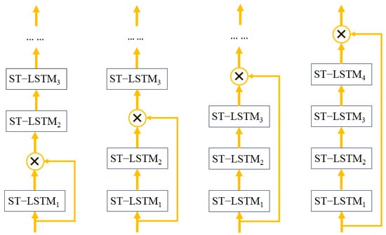 Figure 2 illustrates the application and impact of various jump connection strategies in the ST-LSTM model. The figure presents states with jump lengths of 1, 2, 3, and 4. The leftmost diagram depicts the ST-LSTM structure with a jump length of 1, where information is passed sequentially between layers. Jump connections with single, double, and triple jumps from lower ST-LSTM units to higher ones are introduced. The final diagram shows the structure with the maximum jump length, where information is transmitted directly from the lowest to the highest layer. This structure is more efficient at handling complex spatiotemporal dependencies. We will further explore the impact of these jump connection strategies on model performance and compare the results across varying jump lengths.