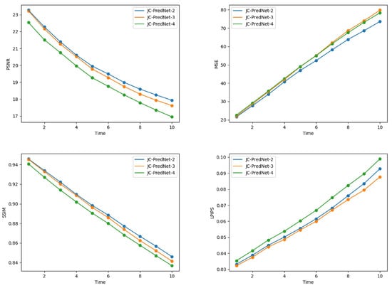 We employed a range of evaluation metrics to thoroughly assess the predictive performance of different models, including MSE, LPIPS, SSIM, and PSNR. Table 1 presents the comparative results across these metrics, focusing on average predictions for the latter ten frames of the sequence. In the table, a lower MSE and LPIPS value (↓) indicates that the predicted image more closely aligns with the actual image, reflecting higher accuracy. Conversely, a higher SSIM and PSNR value (↑) denotes greater fidelity to the original image, signifying better image quality and structural similarity. Our results showcased that JC-PredNet exhibited the most favorable performance across the board. Notably, JC-PredNet achieved an MSE of 48.7, which is 2.7 points lower than that of PredRNN-v2, suggesting a substantial enhancement in prediction accuracy. Similarly, JC-PredNet recorded the highest SSIM at 0.895, surpassing PredRNN-v2 by 0.005 points, and an LPIPS of 0.060, which is marginally better than PredRNN-v2’s 0.066. These improvements highlight the efficacy of the jump connection mechanism in enhancing spatio-temporal prediction accuracy, especially in handling complex dynamics within the sequences. These detailed comparisons provide clear evidence of JC-PredNet’s superior capability in modeling and predicting sequences with intricate motion patterns and varying intensities, positioning it as a significant advancement over existing models like ConvLSTM, TrajGRU, and PredRNN variants.