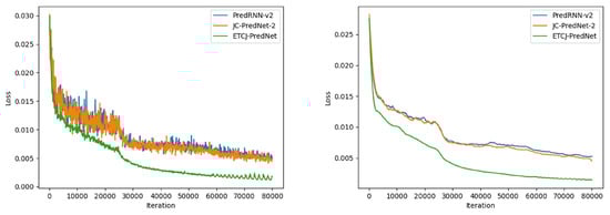 This experiment sought to validate the effectiveness of the temporal correlation attention mechanism in boosting model performance. Building on JC-PredNet to better capture short-term abrupt changes, we analyzed the temporal correlation attention mechanism’s performance by comparing the loss curve convergence of PredRNN-v2, illustrated in Figure 7.