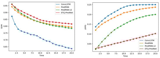 Figure 8 displays the performance change curves for each model over time steps. The SSIM and LPIPS comparisons show that ETCJ-PredNet consistently outperforms the other three models in radar image sequence prediction, with its superiority increasing over time.