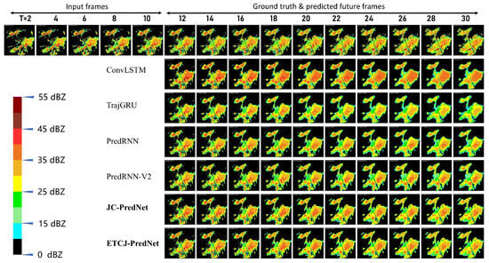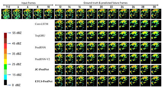 As shown in Figure 9 and Figure 10, we selected a set of predicted images from the test set. To better reflect changes in rainfall intensity, we used the radar echo color scale to display the prediction results and conducted a detailed qualitative comparison of the prediction performance between ETCJ-PredNet and other models, including ConvLSTM, TrajGRU, PredRNN, and PredRNN-V2. Figure 9 focuses on predictions during the precipitation growth phase, while Figure 10 illustrates the dynamic changes during the precipitation decay phase. “Input” refers to the 10 radar echo frames received by the models, while “Ground Truth” and “Prediction” correspond to the actual and predicted radar echo images for the next 20 frames. Each row from t = 12 to t = 30 shows the predicted results from different models compared to the actual radar images at various time steps.