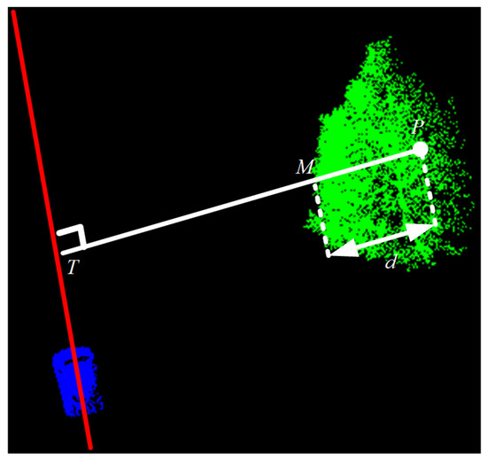 This study sets d as the distance between the target point clouds and the vertical line representing the vehicle’s travel line passing through the tree canopy, after considering that the onboard LiDAR will travel along the road during the data acquisition. According to Figure 6, the blue point clouds represent the collection vehicle, and the corresponding red line represents the vehicle’s travel line, whereas the green point clouds represent the tree point clouds. Among them, P is the target point clouds, the white solid line represents the vertical line between the target point clouds and the vehicle’s travel line, whereas d is the distance that the vertical line passes through the tree canopy, and M is the edge of the tree canopy.