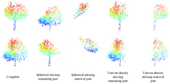 The missing situation closer to the real ones indicates a better model that can learn to predict the missing point clouds. According to Figure 7, it is a comparison between the random spherical missing pattern and the uneven density point clouds loss pattern achieved in this study. Here, the uneven density parameters are, namely, = 1024, = 256, and the attenuation parameter = 2. Comparing the 3rd column with the 5th column in Figure 7, the new loss pattern is closer to the real-world data.