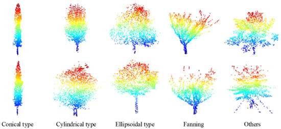 In the self-collected MLS point clouds data, after processed with a specially designed vegetation semantic segmentation model [37], the tree point clouds is separated from the original vegetation point clouds. Therefore, there are a few tree point clouds (such as single tree located at road corners or in parking lots) with a relatively complete collection perspective and a basically complete point clouds structure, which can be used as the initial complete input for TC-Net training. We manually filter the self-collected MLS point clouds of the entire test area and obtain a complete single tree point clouds, as shown in Figure 12, which only accounts for a small part of the entire data and is divided into cone type, cylindrical type, ellipsoid type, fan type, and others. Moreover, 139 of them are designated as the training samples and 33 as the test samples. The detailed information is shown in Table 1.