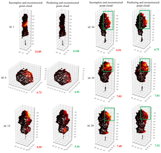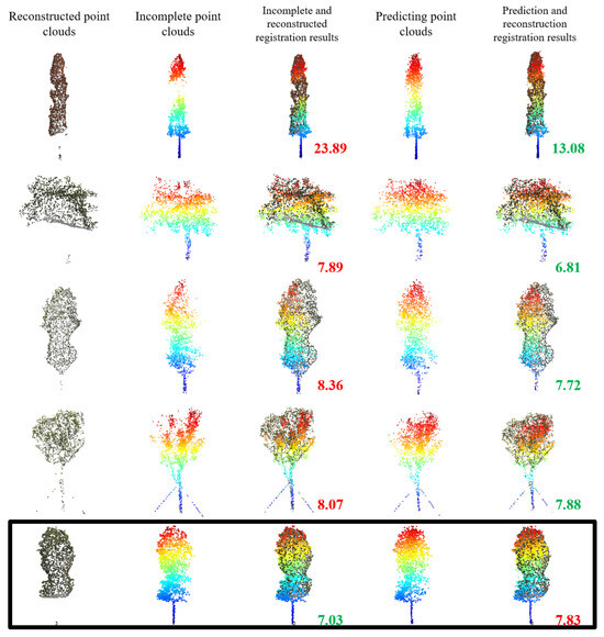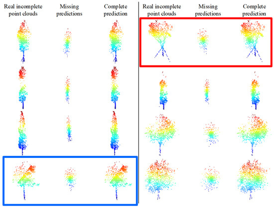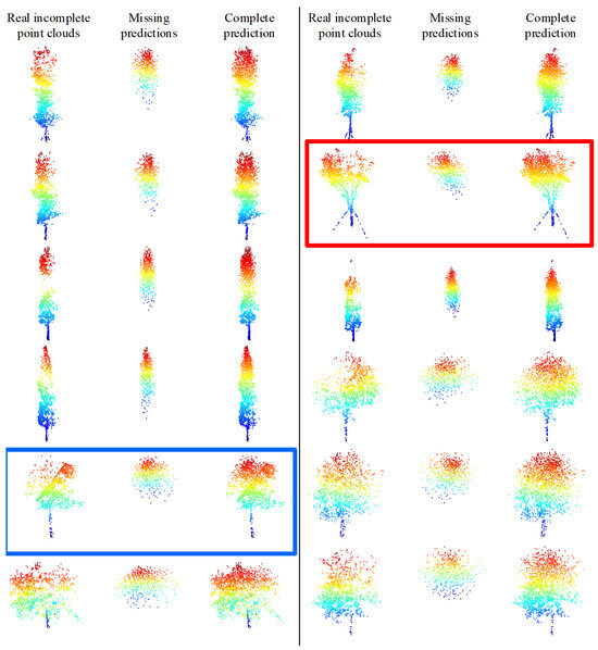 Subsequently, a single tree point cloud has been randomly down-sampled as the input, and the complete structure of the single tree point clouds is obtained through TC-Net prediction, as displayed in Figure 22. According to certain selected results for visualization (the top and bottom rows correspond to the completion effect of individual trees), the TC-Net mode can effectively identify the missing patterns and complete the structural completion, thereby improving the accuracy of subsequent LVV calculations.