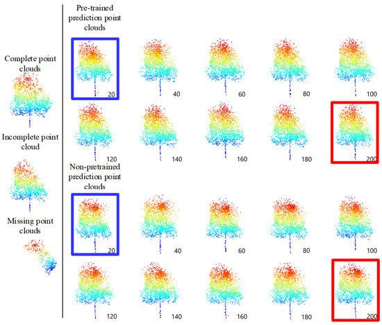 The comparative experiments have been conducted with the same parameters to demonstrate the difference between the pre-trained and non-pre-trained methods. The pre-trained method on 33 single trees point clouds in the testing data set has CD values of 9.20, which is below that of the non-pre-trained method, namely, 9.51. The predicted missing with the pre-trained method is similar to the true missing. Concomitantly, the pre-trained and non-pre-trained models, with an interval of 20 epochs, have been taken to complete the structure completion on the testing data set and to demonstrate the process of the two training methods, and the lane line position is fixed. The completion results are displayed in Figure 19.