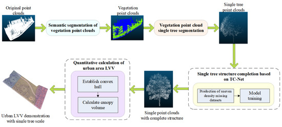 According to Figure 20, the urban area LVV calculation mainly includes the following, namely, (1) semantic segmentation of the original point clouds to extract vegetation information from complex terrain and (2) performing single tree segmentation on the extracted vegetation point clouds to obtain a single tree scale point cloud. (3) Based on TC-Net, the complete structure of a single tree point clouds to obtain a complete single tree point cloud, and (4) calculating the LVV of a single tree in an urban area based on the convex hull model.