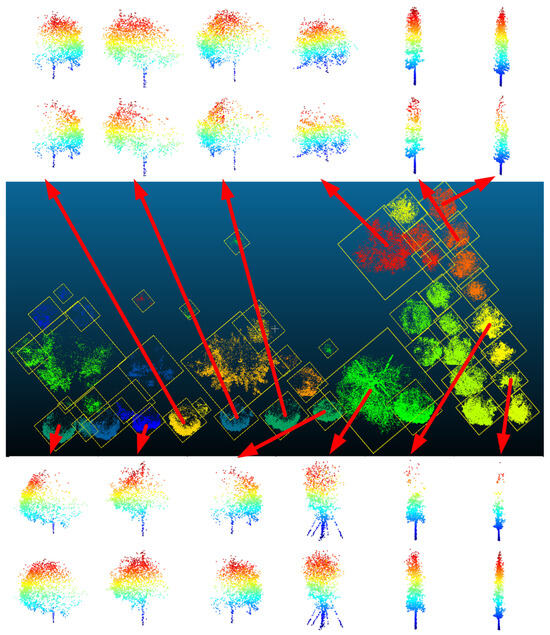 According to the abovementioned LVV automation calculation scheme, this study first performs semantic segmentation based on the HPCT (hierarchical point clouds transformer) [37] model on the point clouds data of TA #1 and extracts the vegetation point clouds in the measurement area. Next, a hybrid clustering method (combining K-Means and DBSCAN) is employed to achieve single tree segmentation of the vegetation point clouds, thus resulting in incomplete single tree point clouds. The results of the single tree segmentation in TA #1 are shown in Figure 21, with each box representing single tree point clouds.