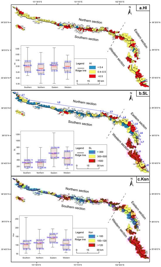 Geomorphic indices’ distribution maps of the LJSFZ (with different colors representing varying levels of activity) and box-and-whisker diagrams (showing the means, medians, interquartile ranges, and data ranges). (a) HI distribution map, (b) SL distribution map and segmentation of fault activity along the northern and eastern sides of the LJFSZ, (c) ksn distribution map.