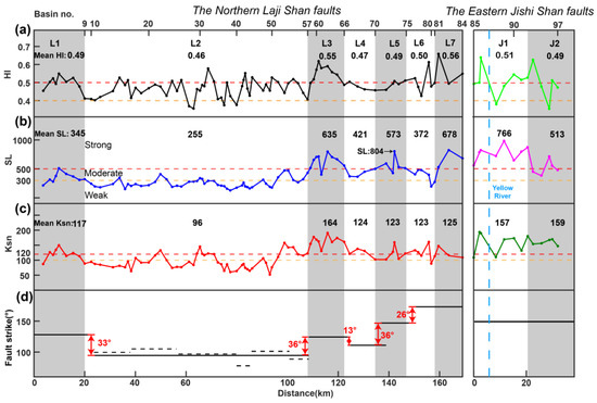 Comparison of geomorphic indices HI, SL, and ksn on the northern Laji Shan and the eastern Jishi Shan faults; the red and yellow horizontal, dashed lines in panels. (a–c) represent the boundaries between strong, moderate, and weak tectonic activity based on El Hamdouni et al. [49]; the blue dashed line represents the location of the Yellow River; (a) variation of HI values along the mountain strike; (b) variation of SL values along the mountain strike; (c) variation of ksn values along the mountain strike; (d) variations in the strike of the northern Laji Shan and eastern Jishi Shan faults.