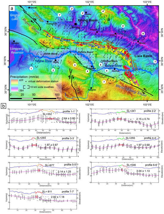 Using the highest-resolution, three-dimensional crustal velocity field data for the northeastern Tibetan Plateau, obtained through GNSS and InSAR joint inversion [43], we extracted seven vertical crustal deformation rate profiles across the Laji-Jishi Shan belt, targeting segments with varying tectonic activity. Each profile spanned 10 km, covering the Laji and Jishi Shan ranges and adjacent Cenozoic basins. We calculated the SL index for drainage basins within these profiles to explore the correlation between uplift rates and SL values, particularly in the basins north and east of the Laji and Jishi Shans (Figure 5a).