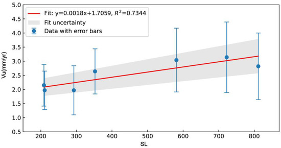 These profiles reveal a clear correlation between uplift rates and SL values. Segments with strong tectonic activity, such as L3, L5, and J1, exhibit higher uplift rates (~3 mm/yr), while segments with weaker activity, like L2, show lower rates (~2 mm/yr). Segments with moderate activity, like L1, have intermediate uplift rates (2–3 mm/yr). Correlation analysis shows a significant positive relationship between uplift rates and SL values (correlation coefficient of 0.84), indicating that geomorphic indices effectively reflect fault activity intensity. The relationship suggests that when SL > 500, the uplift rate typically exceeds 2.60 mm/yr, indicating strong tectonic activity (Figure 6).