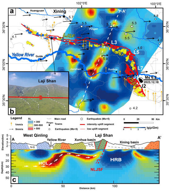 While the resistivity maps at different depths (Figure 7a) may suggest these zones as separate high-conductivity bodies, our interpretation, based on the A-A′ cross-section, suggests that they form a locally continuous low-resistivity structure. Zhao et al. (2022) [38] describe this low-resistivity body as migrating from south to north, ascending from deeper to shallower levels, and being obstructed by a high-resistivity body beneath the Xining Basin (Figure 7c). This obstruction likely causes the concentrated uplift observed at the L3 segment.