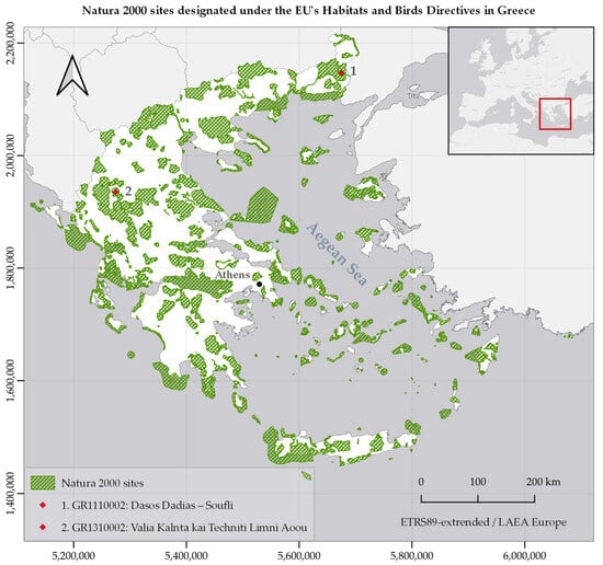 Greece is located in the Mediterranean basin biodiversity hot-spot and boasts a diverse range of ecosystems and species. The uniqueness of Greek nature is characterized by its high species density and a variety of different ecosystems and landscapes. Notably, Greece has a particularly rich and diverse flora, with 5700 recorded species, of which approximately 13.2% are endemic due to its complex landscape and morphology []. The fauna of Greece is known for its high rate of endemism, with a total of 23,130 recorded species of terrestrial and freshwater animals, as well as 3500 marine species [,]. According to the World Wildlife Fund (WWF), Greece is home to 8% and 40% of Europe’s animal and plant species []. The rich biodiversity is reflected in the designation of 446 sites as part of the European Natura 2000 network, covering 27% of the country’s land area and over 19% of its marine territory. These protected areas in Greece are managed by the Natural Environment & Climate Change Agency (NECCA) under the Greek Ministry of Environment and Energy (Figure 1). The Natura 2000 network in Greece includes both areas heavily affected by recent disastrous wildfires (as in the case of the GR 1110002 Dasos Dadias-Soufli site) and remote areas under a rigorous protection regime, with limited human presence (as in the case of the GR 1310002 Valia Kalnta kai Techniti Limni Aoou site).