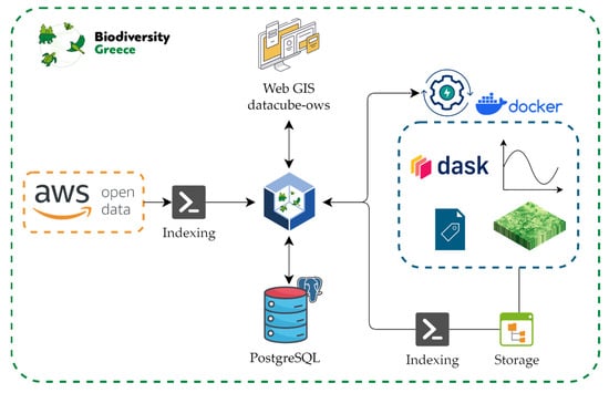 The EL-BIOS EODC infrastructure relies the ODC framework to organize and analyze EO data []. It comprises a catalogue of Sentinel-2 Level-2A imagery hosted on AWS. EO workflows have been developed to analyze satellite images time series and extract SEO biodiversity products through ODC APIs. The resulting Cloud-Optimized GeoTIFFs (COGs) are stored and indexed in the EL-BIOS EODC. These COGs can be visualized in a Web GIS interface using Open Web Services (Figure 2). The application’s development was based on open-source software. The following sections provide an analytical description of the process.
