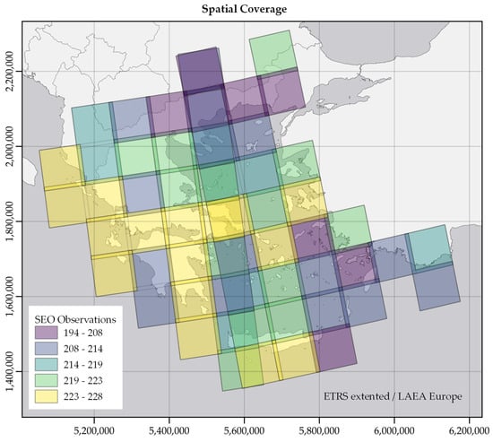 The EL-BIOS EODC consists of 60 MGRS tiles and spans from January 2017 onwards. Despite the presence of high cloud cover or incomplete datasets, which increased the proportion of invalid data, the developed EO workflows achieved 88.47% dataset coverage (Figure 4). In total, 13,005 of the 14,700 datasets were computed and indexed in the EL-BIOS data cube. More than 225 observations, as the 90th percentile of tile-based coverage, were observed in the MGRS tiles 34SDG, 34SFF, 34SFH, 34TCK, 35SKC, 35SLU and 35SMC, which are mainly located in central Greece. The archive had less than 207 observations, as the 10th percentile, in Eastern Macedonia and Thrace, as evidenced by MGRS tiles 34TFL, 35SMU, 35TKF, 35TKG, 35TLF and 35TMF.