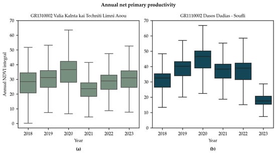 Annual net primary productivity as measured through the annual integral of NDVI between 2018–2023 for two sites of the Natura 2000 network in Greece (a) GR1310002 Valia Kalnta kai Techniti Limni Aoou (i.e., point #2 in Figure 1), (b) GR1110002—Sitename: Dasos Dadias—Soufli (i.e., point #1 in Figure 1).