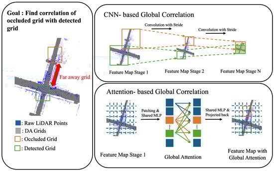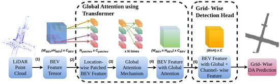Global attention using Transformer: Given the challenges of grid-wise DA detection due to LiDAR occlusions and surrounding obstacles, we employ a global attention mechanism based on Transformers. Inspired by recent work on attention mechanisms in computer vision [] and Global Feature Correlators (GFC) in LiDAR-based lane detection [], our global attention Transformer identifies correlations between patches in the BEV map, aiding in DA prediction even in occluded regions without point cloud data. The BEV tensor is divided into patches, each flattened into a tensor of dimensions . We then compute patch correlations using a Transformer-based mechanism []. An explanation of using global attention and CNN to find spatial features and semantic features of DA around ego-vehicle can be seen in Figure 5.