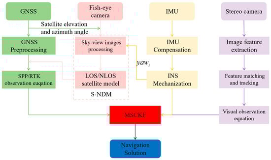 First, this section provides a brief background on the GNSS observation model, the INS dynamic model, and the visual observation model to pave the way for homogeneous sensor fusion. In light of the aforementioned, the state model and the measurement model of the Sky−GVIO are described. Finally, NLOS detection is implemented using the segmentation results discussed in Section 2.1, and an LOS/NLOS model is established to mitigate NLOS effects.