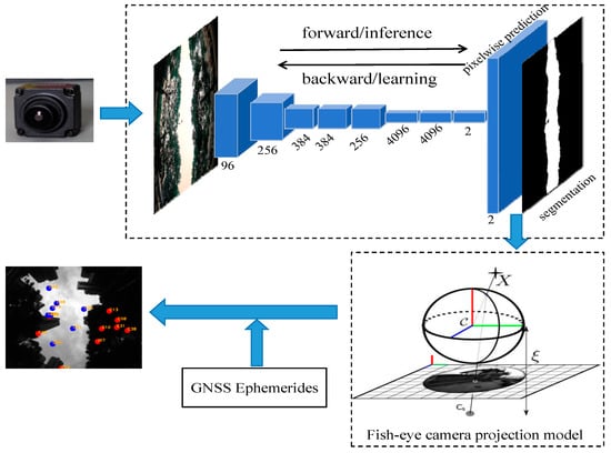 For the accurate modeling of the GNSS noise covariance in the integration of tightly coupled GNSS/INS/Vision, it is essential to differentiate between LOS and NLOS satellites. Therefore, we obtain a sky-mask after performing the semantic segmentation of the sky-view images using an FCN, and subsequently, based on the projection model mentioned in [] and the satellite information, including the elevation and azimuth angles provided by the satellite ephemeris, we ultimately identify the LOS and NLOS conditions around the GNSS receiver. Figure 3 shows the overall flow of the S−NDM algorithm. In this process, if the satellite’s projection is located in the sky region, then the satellite will be classified as an LOS satellite (represented by a blue dot), and if not, it will be classified as an NLOS satellite (represented by a red dot). Through this satellite visualization strategy, we can obtain the judgment conditions of Equations (22) and (23). This satellite visualization strategy is more reliable than the strategy of judging conditions by an experience threshold, as in []. This is also the difference between LOS/NLOS signal modeling in this paper and traditional methods.
