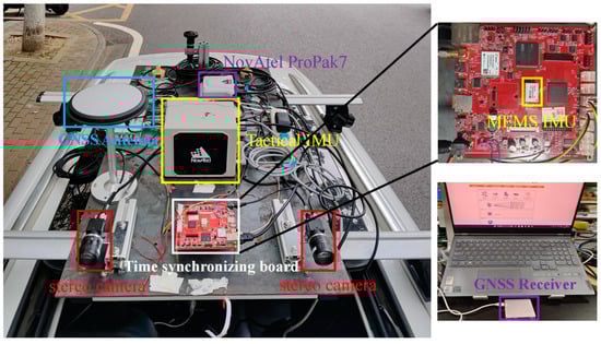 As is shown in Figure 4, the data acquisition platform consists of a GNSS receiver (Septentrio mosaic-X5 mini, Septentrio, Brussels, Belgium), GNSS antenna (NovAtel GNSS-850, NovAtel, Calgary, AB, Canada), two forward-looking cameras (FLIR BFS-U3-31S4C-C, FLIR Systems, Wilsonville, OR, USA), a sky-pointing fish-eye camera (FE185C057HA-1, FUJINON, Fuji, Japan), a tactical-grade IMU (NovAtel SPAN-ISA-100C, NovAtel , Calgary, AB, Canada), an MEMS-IMU (ADIS-16470, ADI, Boston, MA, USA), and a time synchronization board. The time synchronization board unifies the time of all sensors to GPS time through pulse per second (PPS) generated by the GNSS receiver. The sampling rates of GNSS, MEMS-IMU, forward-looking cameras, and fish-eye camera are 1 Hz, 100 Hz, 10 Hz, and 1 Hz, respectively. In addition, the NovAtel SPAN-ISA-100C interacts with NovAtel’s ProPak7 receiver via a highly reliable IMU interface. The tightly coupled multi-GNSS post-processing kinematic (PPK)/INS bidirectional smoothing position results can be obtained through commercial IE 8.9 software and used as a reference truth value. Table 1 lists the specific parameters of the two IMUs. We use the Linux operating system and an Intel Core i7-9750H processor running at 2.6 GHz and with 32 GB memory. In addition, the data are processed on a laptop with NVIDIA GeForce RTX 3060 Ti GPU (graphics processing unit) based on Ubuntu 18.04 (Canonical Ltd., London, UK). Meanwhile, we used opencv3.4.9 [] to process the images in the tightly coupled system.