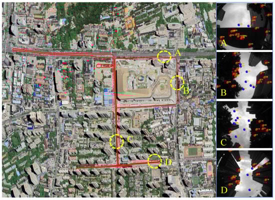 The experimental route and scene in the urban canyon. ((A–D) on the right correspond to the sky-view images of the four scenes in the trajectory, respectively. In the sky-view images on the right, the red dots represent the NLOS satellite, and the blue dots represent the LOS satellite).