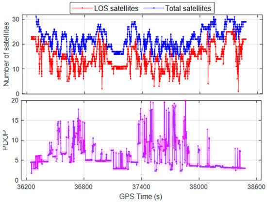We collected vehicular data in a typical urban canyon area in Wuhan on 3 September 2023. The experimental trajectory and surrounding landscape, featuring high-rise structures, dense foliage, and overpasses, are illustrated in Figure 5. The number of satellites and the position dilution of precision (PDOP) values for this route are shown in Figure 6. Combined with the LOS/NLOS satellite conditions presented in Figure 5, it is conceivable that our testing environment is plagued by severe GNSS NLOS, multipath, and cycle slip issues. These complications not only impair GNSS−based positioning accuracy but also challenge the reliability of GNSS/INS/Vision integration model, which depends on GNSS for absolute position information. The choice of such a challenging environment underscores the purpose of the experiment, which is to validate the efficacy and dependability of S−NDM algorithm and Sky−GVIO model introduced in this study.