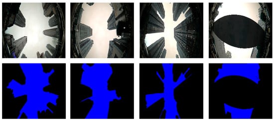 In addition, we briefly introduce our sky-view image dataset, including the training dataset and the testing dataset. The training dataset contains 440 images, and the testing dataset contains 2000 images, each with a resolution of 1432 × 1164 pixels. These data were collected in typical urban canyons in two different areas of Wuhan, which contain trees, tall buildings, and light poles. Therefore, this dataset is very suitable for sky-view image segmentation experiments. Figure 7 shows the sky-view images that we have labeled semantically, with blue representing the sky area and black representing the non-sky area.