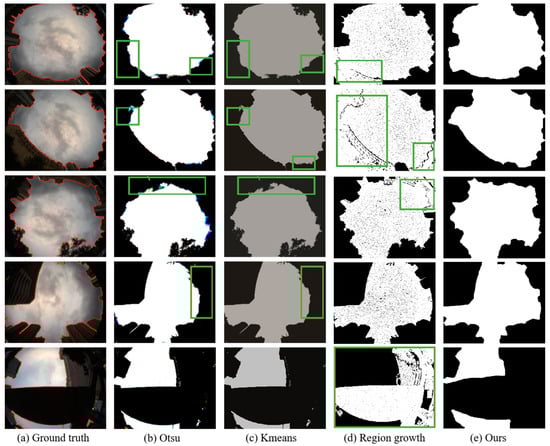 Experimental results of sky-view image segmentation using different methods. From left to right: Ground truth with the outline of sky region (red line), followed by the segmentation results using Otsu, Kmeans, region growth, and our proposed method, respectively. Regions that are incorrectly segmented are highlighted in green boxes.