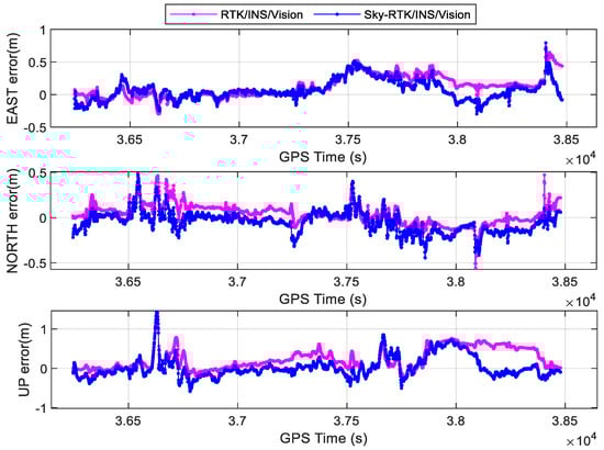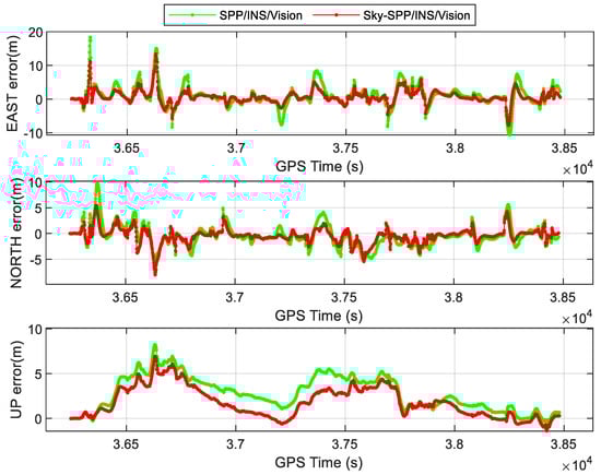 The time series of position errors for different tightly coupled RTK−related models are shown in Figure 11, and the corresponding RMSEs are summarized in Table 3. The positioning accuracy of RTK/INS/Vision in E, N, and U directions are 0.21, 0.13, and 0.36 m. It can be seen that the positioning accuracy of Sky−RTK/INS/Vision is 0.16, 0.11, and 0.27 m in E, N, and U directions, which outperforms RTK/INS/Vision. Compared with RTK/INS/Vision, the positioning accuracy of Sky−RTK/INS/Vision is improved by 24%, 15%, and 25% in E, N, and U directions, respectively. These considerable improvements in the positioning accuracy mainly stem from GNSS NLOS detection and mitigation enhanced by sky-view images, which makes the weighting of GNSS observations more reasonable. Meanwhile, we find that the S−NDM algorithm acts on SPP/INS/Vision better than RTK/INS/Vision in terms of positioning accuracy. This is because the positioning accuracy of SPP is lower than that of RTK positioning, and there is a lot of room for its enhancement; in addition, the NLOS has a greater effect on the pseudorange caused by the NLOS.