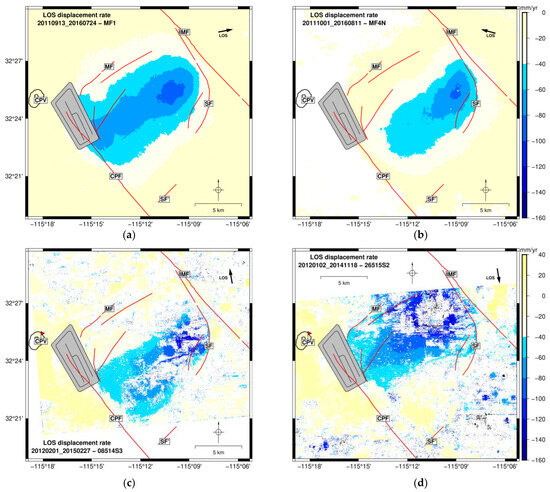 - Sarychikhina, O.; Glowacka, E.; Robles, B. Multi-sensor DInSAR applied to the spatiotemporal evolution analysis of ground surface deformation in Cerro Prieto basin, Baja California, Mexico, for the 1993–2014 period. Nat. Hazards 2018, 92, 225–255. [Google Scholar] [CrossRef]