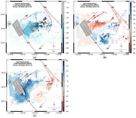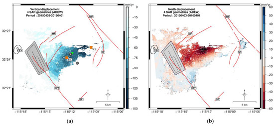 - Xu, X.; Sandwell, D.T.; Tymofyeyeva, E.; Gonzalez-Ortega, A.; Tong, X. Tectonic and Anthropogenic Deformation at the Cerro Prieto Geothermal Step-Over Revealed by Sentinel-1A InSAR. IEEE Trans. Geosci. Remote Sens. 2017, 55, 5284–5292. [Google Scholar] [CrossRef]