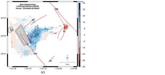 - Donnellan, A.; Parker, J.; Hensley, S.; Pierce, M.; Wang, J.; Rundle, J. UAVSAR observations of triggered slip on the Imperial, Superstition Hills, and East Elmore Ranch Faults associated with the 2010 M 7.2 El Mayor-Cucapah earthquake. Geochem. Geophys. Geosystems 2014, 15, 815–829. [Google Scholar] [CrossRef]