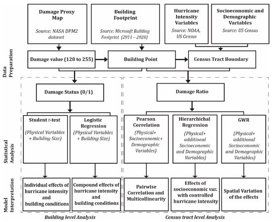While ordinary least squares (OLS) regression provides a global model for the entire study area, the GWR uses local models to capture the spatial variation between building damage and the selected variables []. In this study, the GWR model was first applied to examine the relationships between the damage ratios and the hurricane intensity variables. Then, the GWR model was applied to quantify the effects of the individual socio-economic variables on the damage ratios by controlling the hurricane intensity variables. The neighborhoods were selected using the “Golden Search” method. The “Golden Search” method finds the optimal bandwidth parameter that minimizes the Akaike information criterion (AIC) value in the GWR model, allowing for more accurate and localized spatial predictions []. The entire analytical workflow of this study is illustrated in Figure 2.