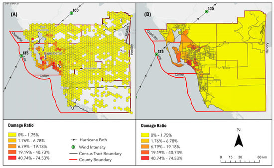 A hexagon bin map is created to visualize the spatial variation in the damage ratios (Figure 3A). Compared to choropleth maps, hexagon bin maps can eliminate the influence of varying sizes of administrative boundaries and the populations in the boundaries. Unlike other bin shapes (e.g., square bins), hexagonal bins can better reflect natural clustering patterns [] and minimize edge effects []. For these reasons, hexagon bins are often preferred for depicting spatial patterns in heterogenous geographic contexts.